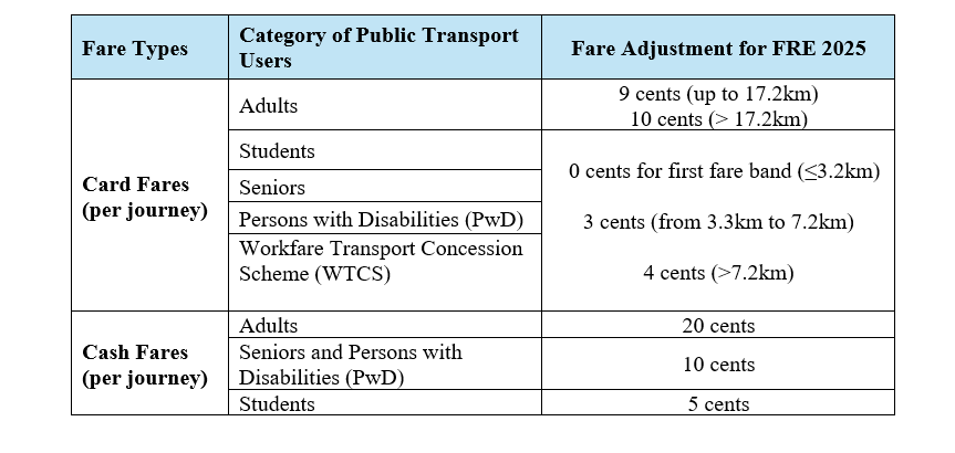 5 Per journey cash fares will increase by 5 cents for students, 10 cents for seniors and persons with disabilities, and 20 cents for adults and other commuters. This reflects the higher operating costs of cash handling. Less than 1% of all public transport journeys were paid in cash, and cash fares were last adjusted in 2023.