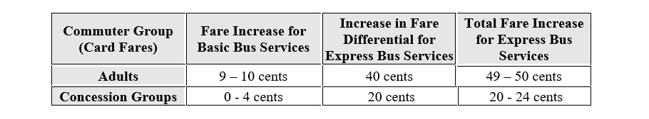 Express bus card fare differential over basic bus fares will increase by 40 cents for adults and 20 cents for concession groups